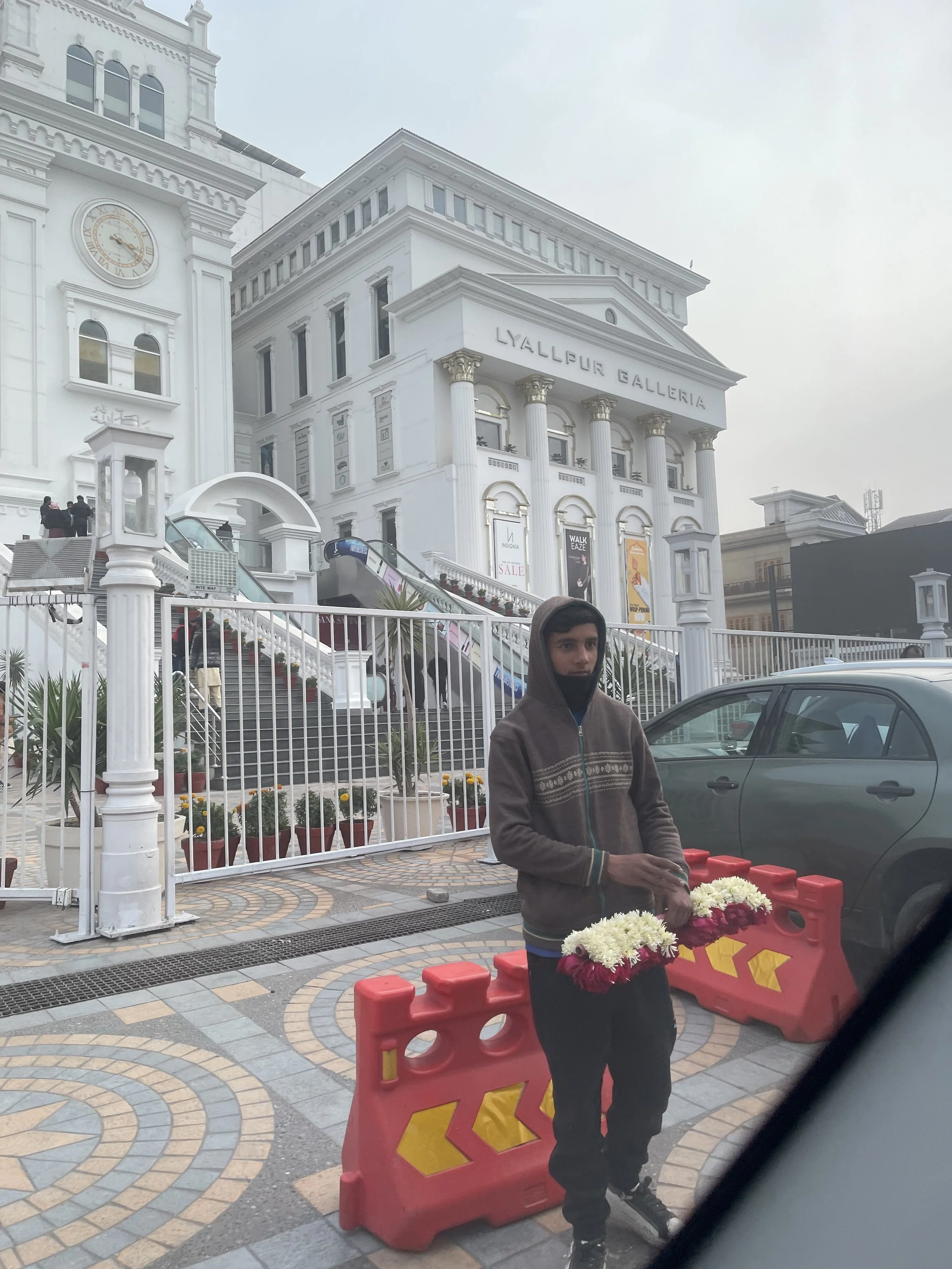 A boy selling gajre - flower bangles in front of the Lyallpur Galleria mall.