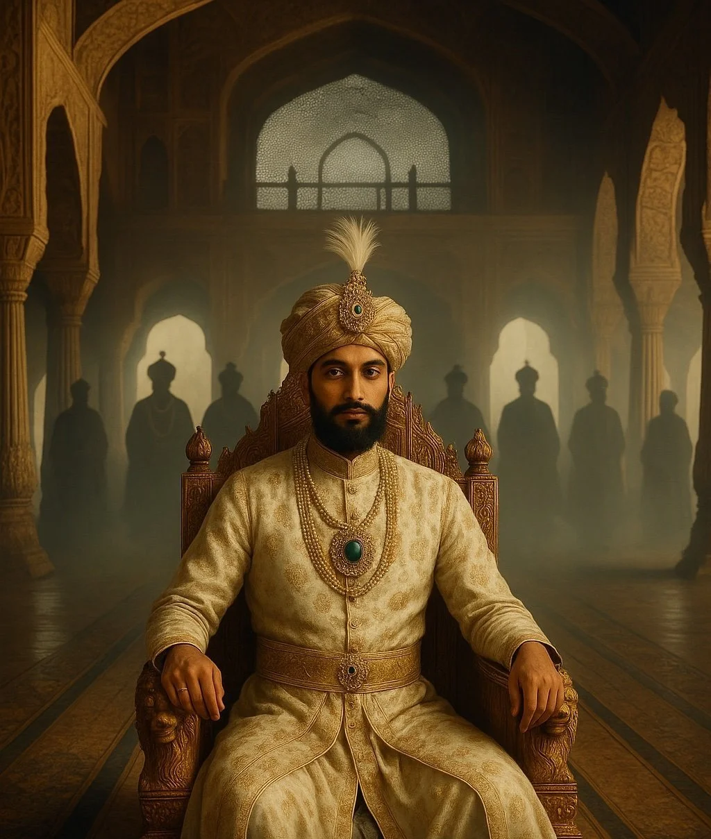 A depiction of Emperor Muhammad Shah on the Mughal throne after years of conflict and turmoil - the shadows of past emperors, once powerful and commanding, loom behind.